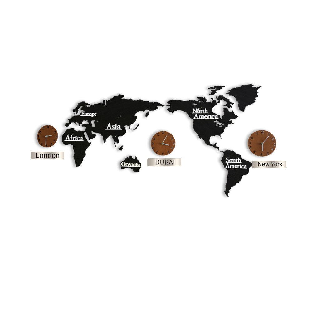 - **Materiales de calidad:** Mapa en acabado negro mate y relojes con detalles en madera para un toque cálido.